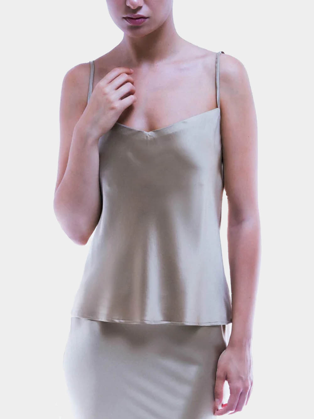 The Camisole silk top is available in three colors: onyx (black), diamond (white) and tourmaline (beige/champagne color).