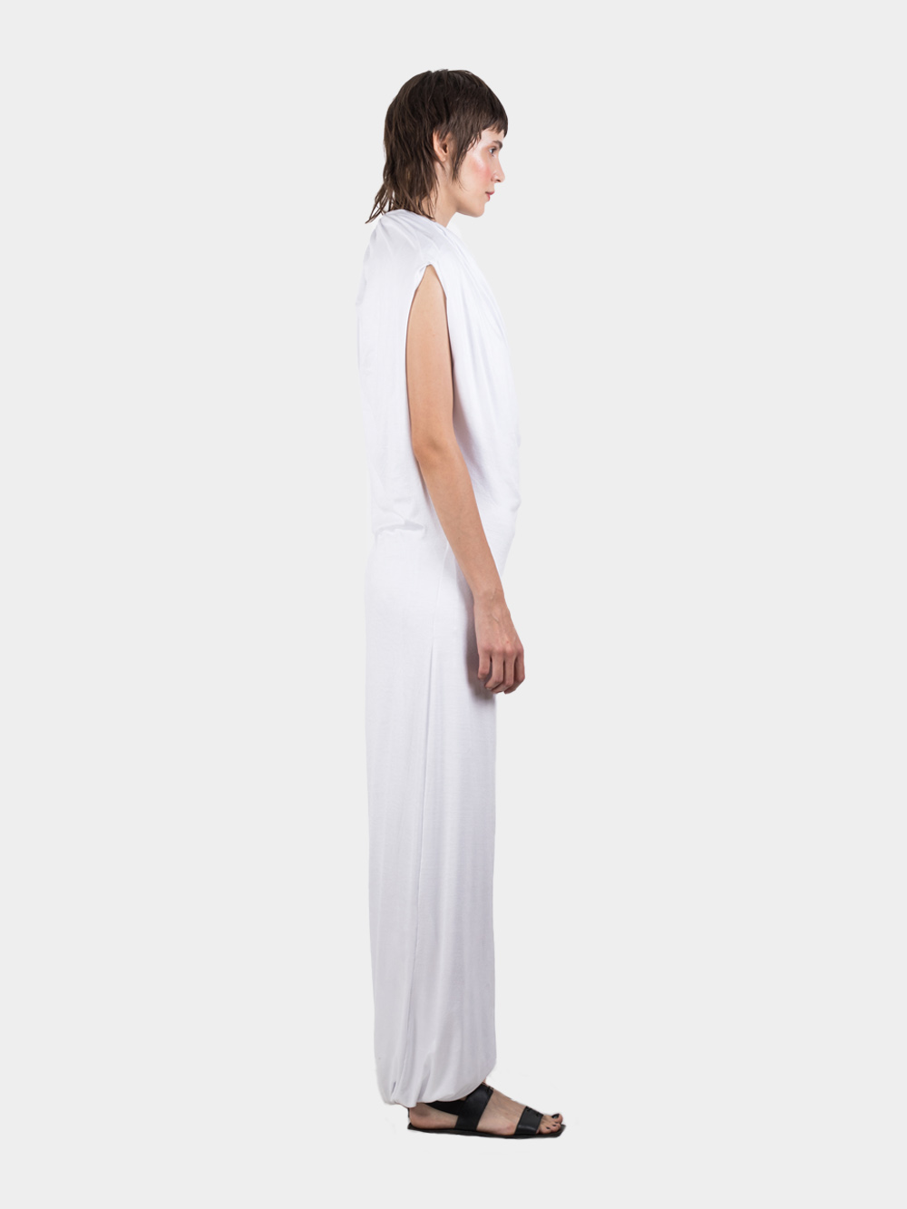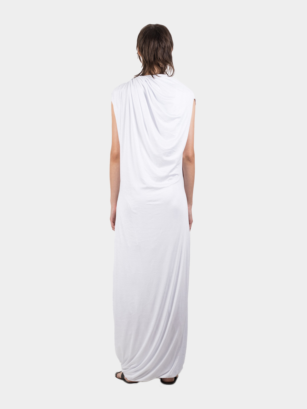 Made of soft stretch cotton blend with a slight shine, the white maxi dress by Ludus represents a modern take on the long, relaxed fitting dress. The body fitting silhouette and circular draped neckline make it alluring but polished and add a modern twist to the classic shape.