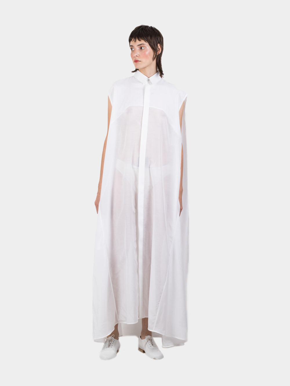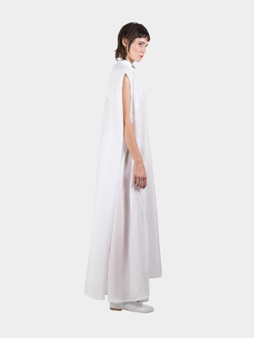 Ludus is an agender label known for its strong garments handmade of natural fabrics with zero waste in the production cycle. Long sleeveless shirt dress in fresh white color redefines the classic piece with a circle cut back that ensures modern voluminous silhouette. Made of cotton and silk blend, the shirt feels cool and smooth against the skin. Slim cut collar and front covered placket button closure add a modern twist to the classic shape, making it alluring but polished.