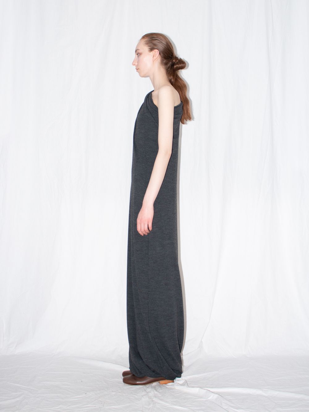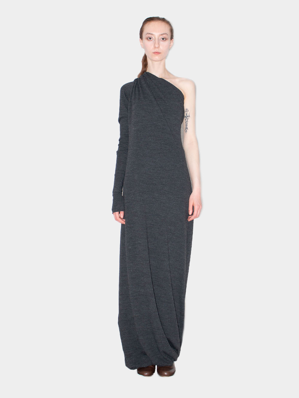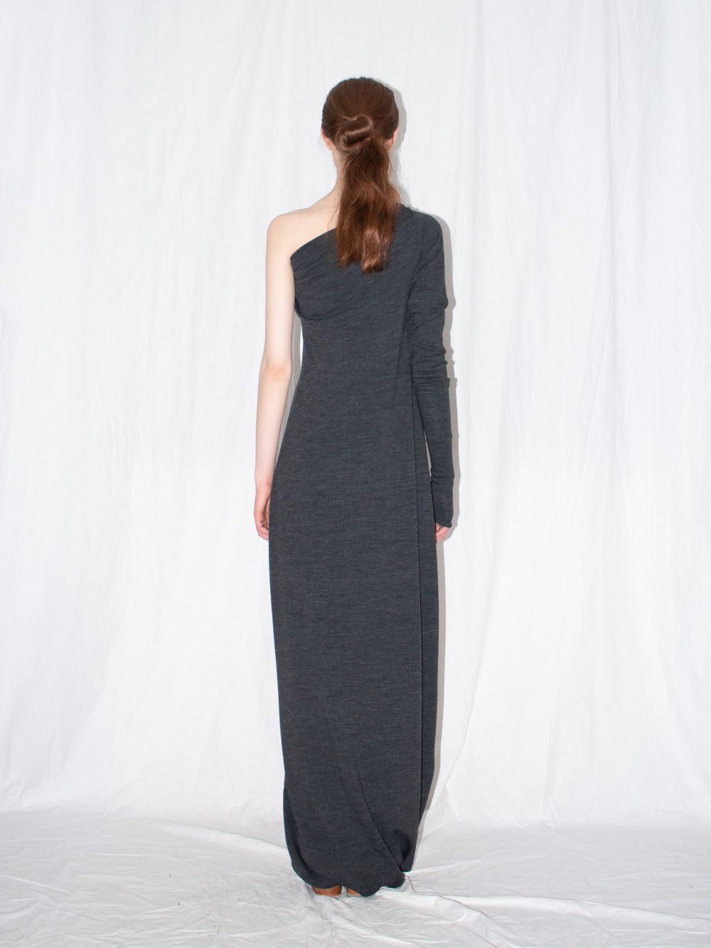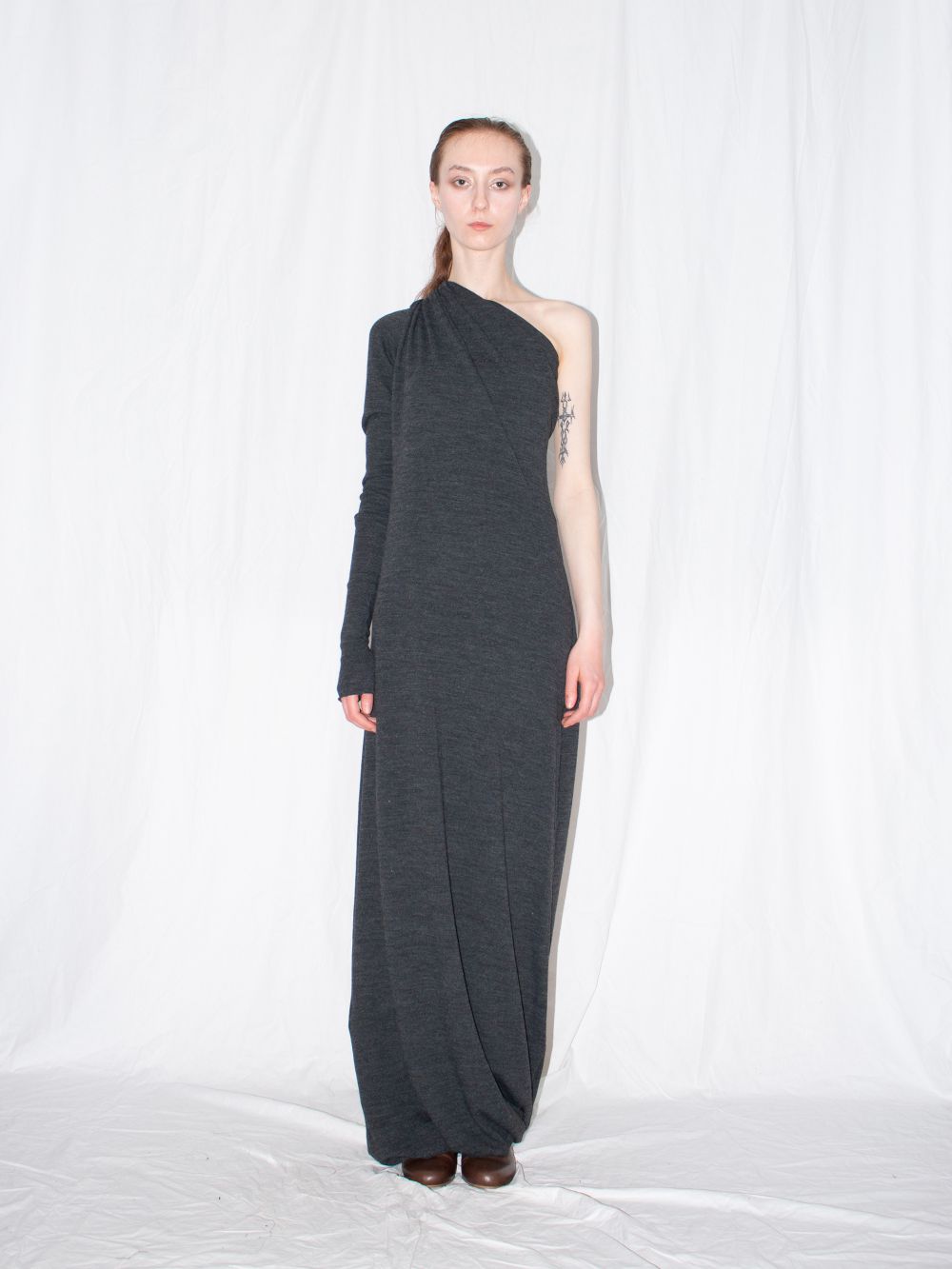 Long wool dress by Ludus marries a timeless aesthetic with contemporary elements. Designed in a seasonless grey hue, the sophisticated long cut is offset with form-fitting silhouette, signature circular drape and one-shoulder top for a modern edge. The dress is constructed from a locally-sourced wool and elastane fabric blend.