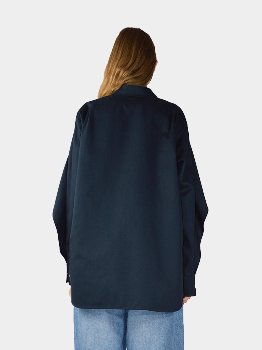 Shirt by JORSYN- redefines the classic women’s shirt with an elegantly prolonged, oversized silhouette and unexpected voluminous sleeves. Made of the highest quality viscose in a bright dark blue color, the shirt has a very delicate and silky feel. Finishing touches include a classic shirt collar, a breast pocket, and a front button closure.