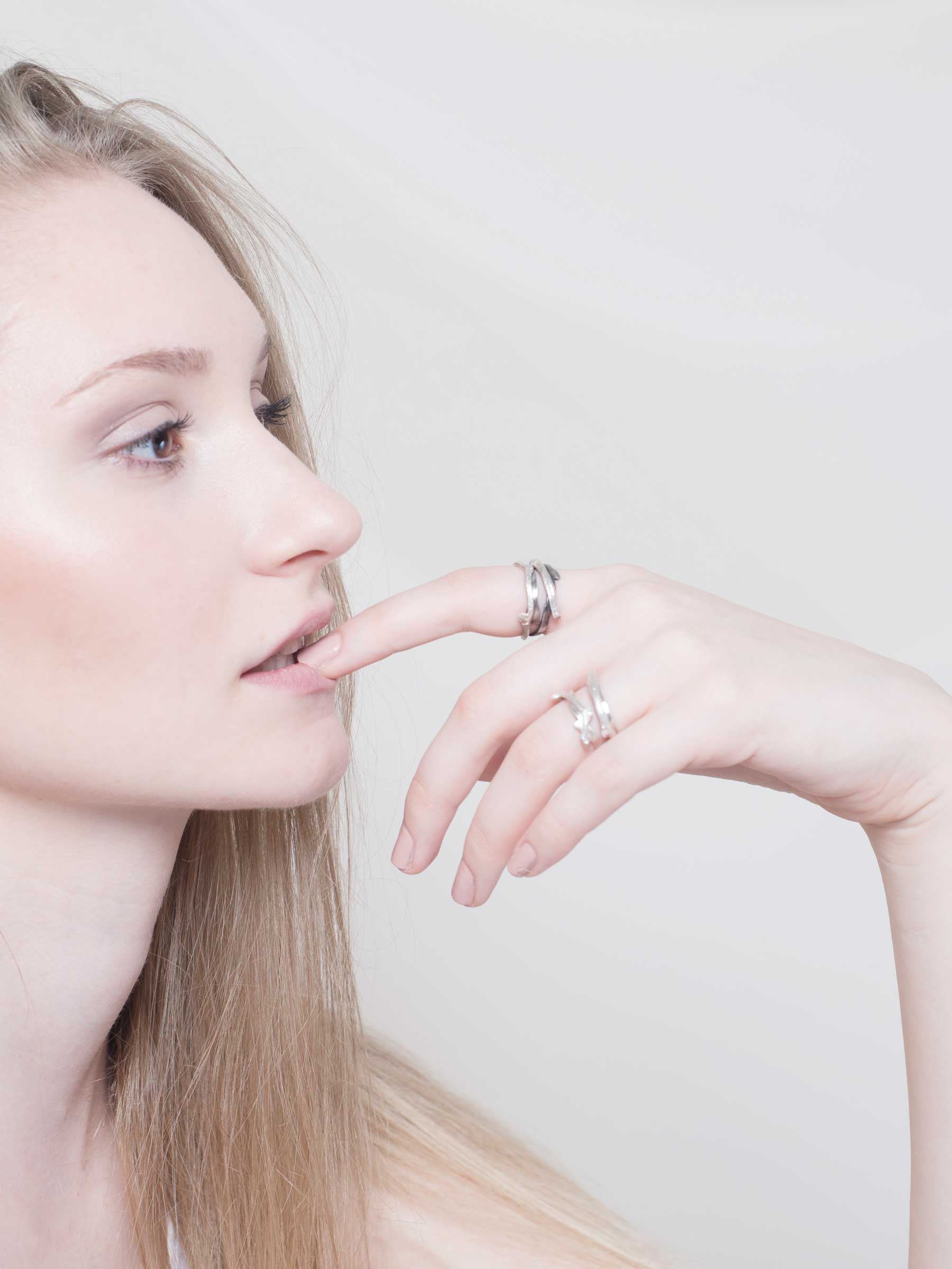 The intricate yet lively form of the Sanda Vidmar Twig Ring celebrates playful tenderness of the natural world. Designed and handcrafted in her studio in Ljubljana, Slovenia, each ring is unique and made with special attention to detail, embracing the natural imperfections of the hand work. This powerful jewellery piece is made of 925 sterling silver and comes in unique packaging with enclosed personal note.