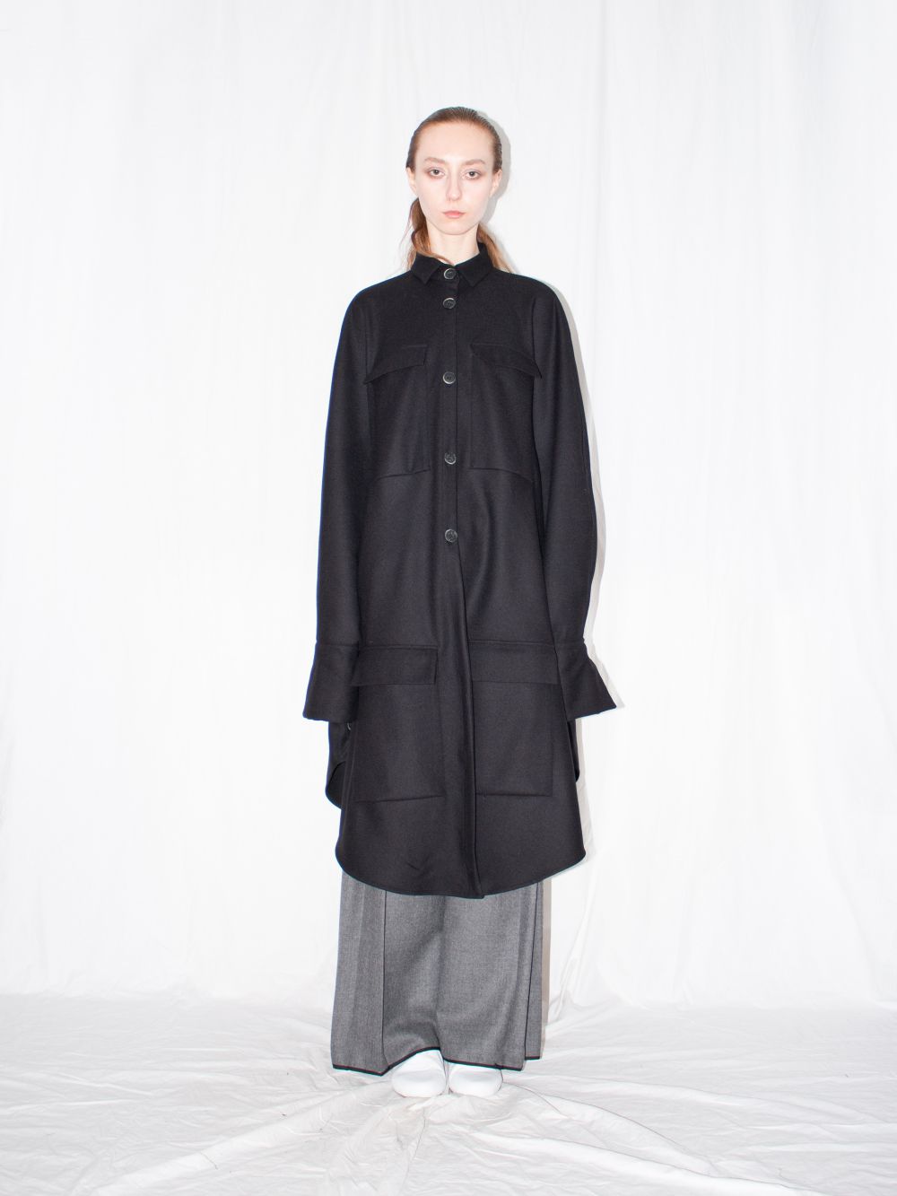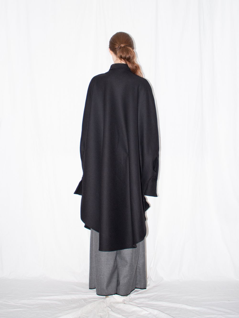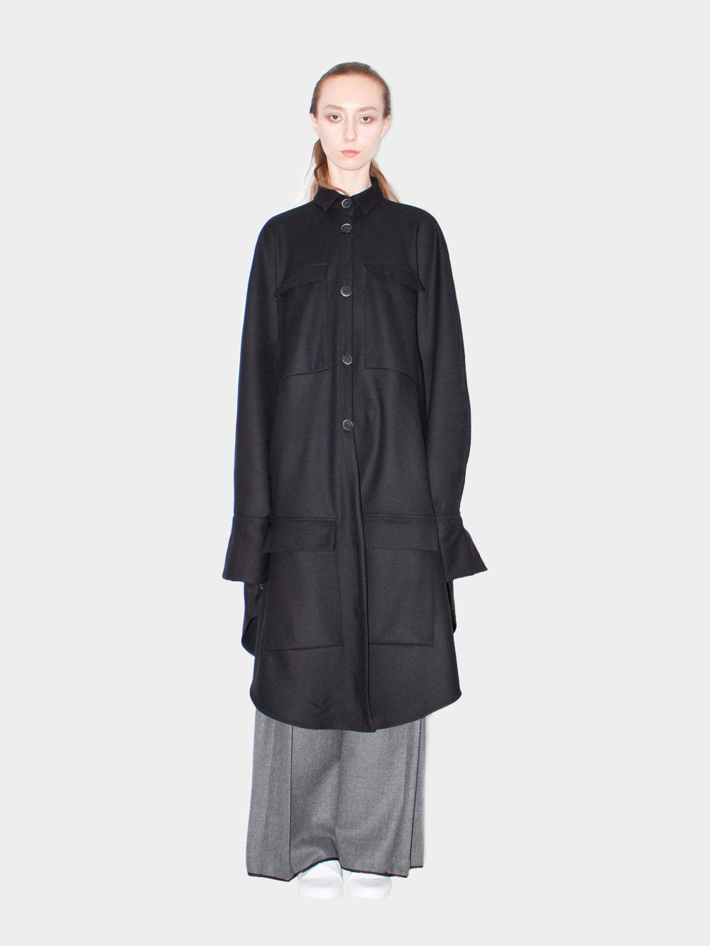Black cloak shirt by Ludus redefines the classic piece with a long, voluminous silhouette and flattering fit. Made of soft Macedonian wool in seasonless black hue, the shirt will keep you warm while looking modern throughout the colder months. Finishing touches include slim cut collar, front placket button closure, buttoned side seam vents and elongated one button sleeve cuffs.