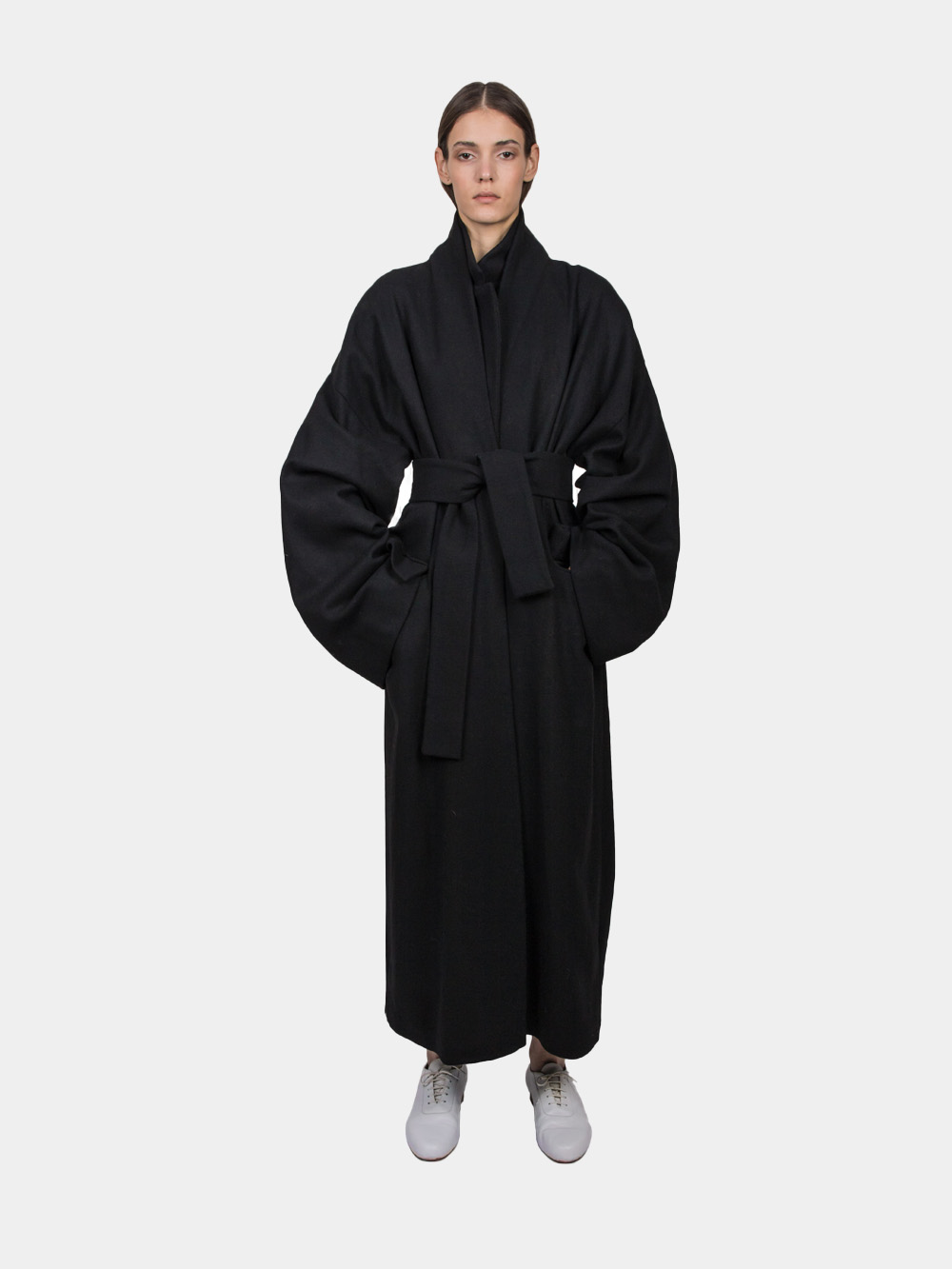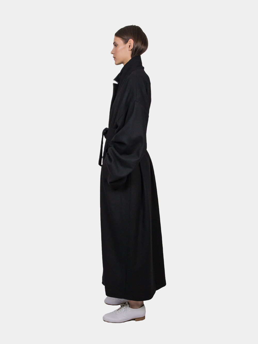 Black overcoat by Ludus redefines the classic coat with voluminous silhouette, double stacked lapel and elongated sleeves. Made of 100% virgin wool and lightweight cotton lining, this statement piece is designed to be worn loose or cinched at the waist with the same fabric waist belt. Finishing touches include two front pockets and double stacked collar.